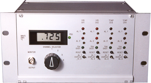 Type : 19" conforme IEC 297-3 Nombre de voies : 1 à 12 voies + affichage Affichage : Numérique 3 ½ digits Sélection de la voie : Par commutateur Output : Sortie AC signal capteur sur prise BNC Alimentation : 220 VAC Température : 0 - 70 °C Dimensions L x H x P : 482.6 x 133.5 x 190.0 mm Dimensions des voies l x h x p : 128.5 x 25.4 mm